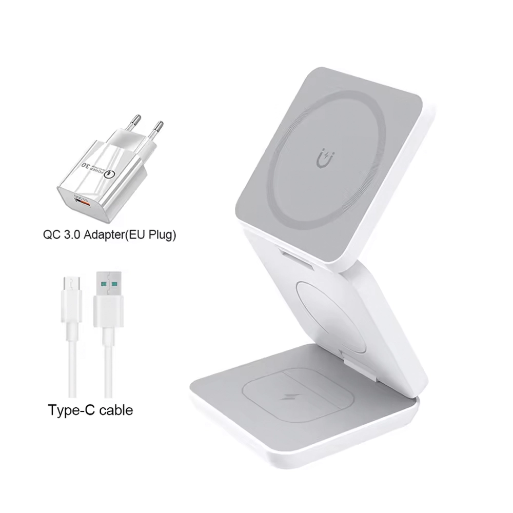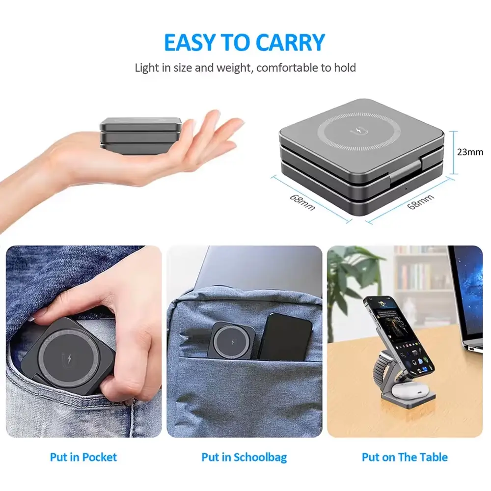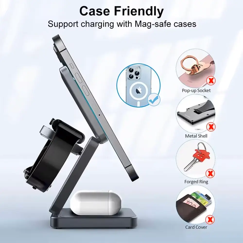 Foldable 3-in-1 Magnetic Wireless Charging Station designed for iPhone 15/14/13/12 Pro Max, Apple Watch Series 9/8, and Qi-Compatible Earbuds.