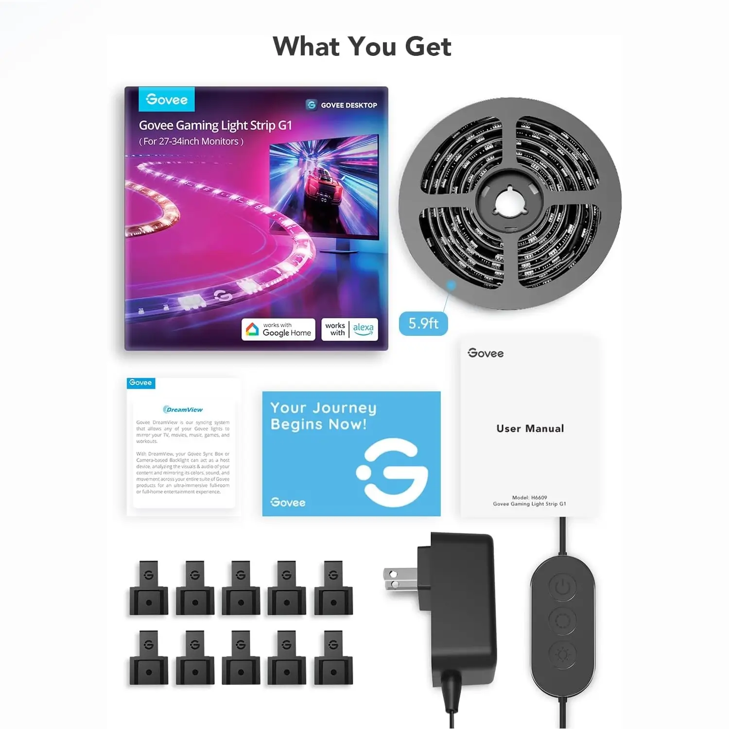 Transform your gaming setup with the Govee G1 Light Strip, designed to fit screens from 27 to 34 inches. This dynamic RGB light strip enhances your gaming experience by providing vibrant, customizable lighting that reacts to your gameplay. With easy app control and multiple lighting modes, you can create the perfect immersive atmosphere that brings your games to life. Easy to install and compatible with voice assistants, the Govee G1 Light Strip is the ultimate accessory for any serious gamer looking to elevate their setup.