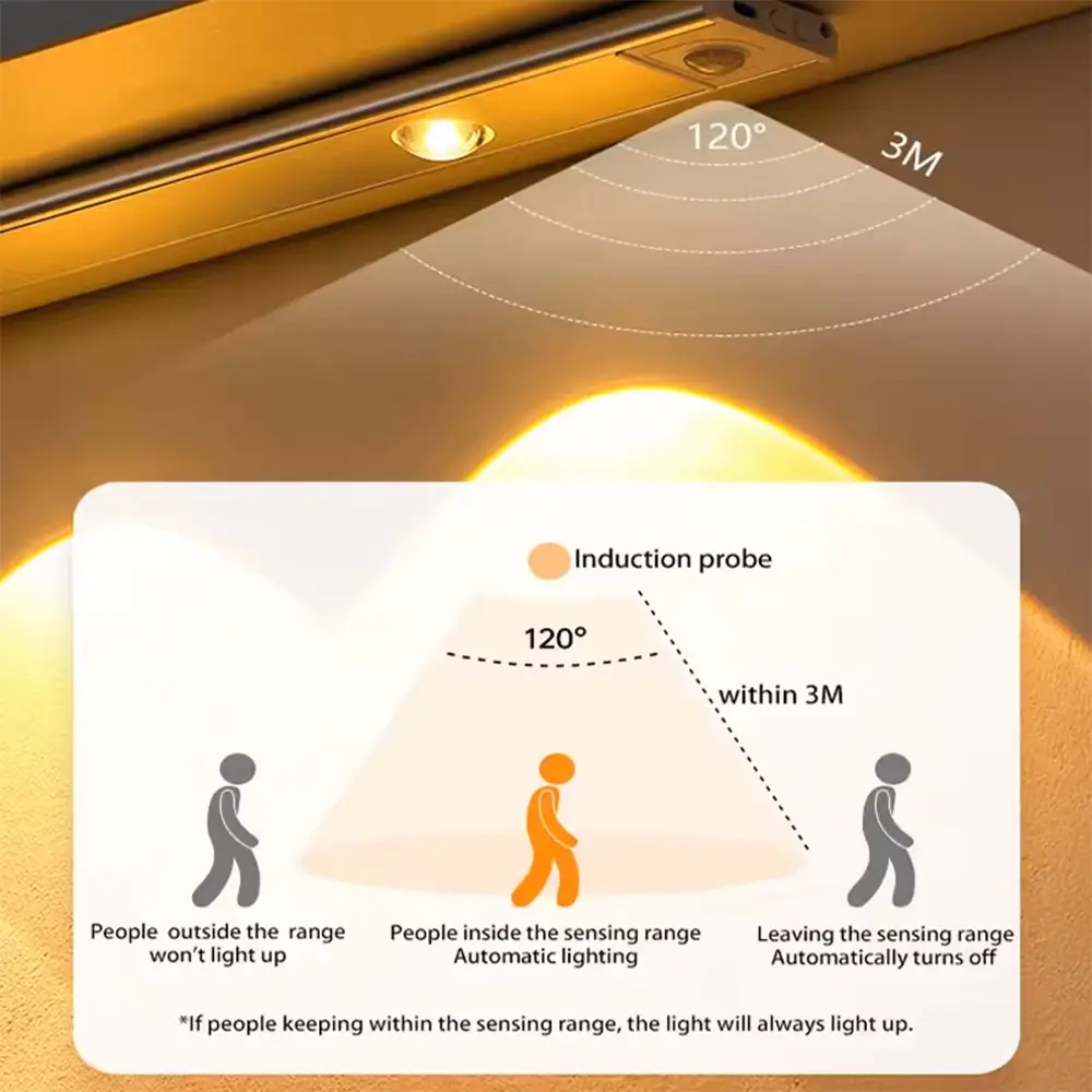 • Motion-Activated Lighting: The light turns on automatically when it detects movement within 3 meters or at a 120° angle in dark or dim environments. It automatically shuts off after 25 seconds to conserve battery.