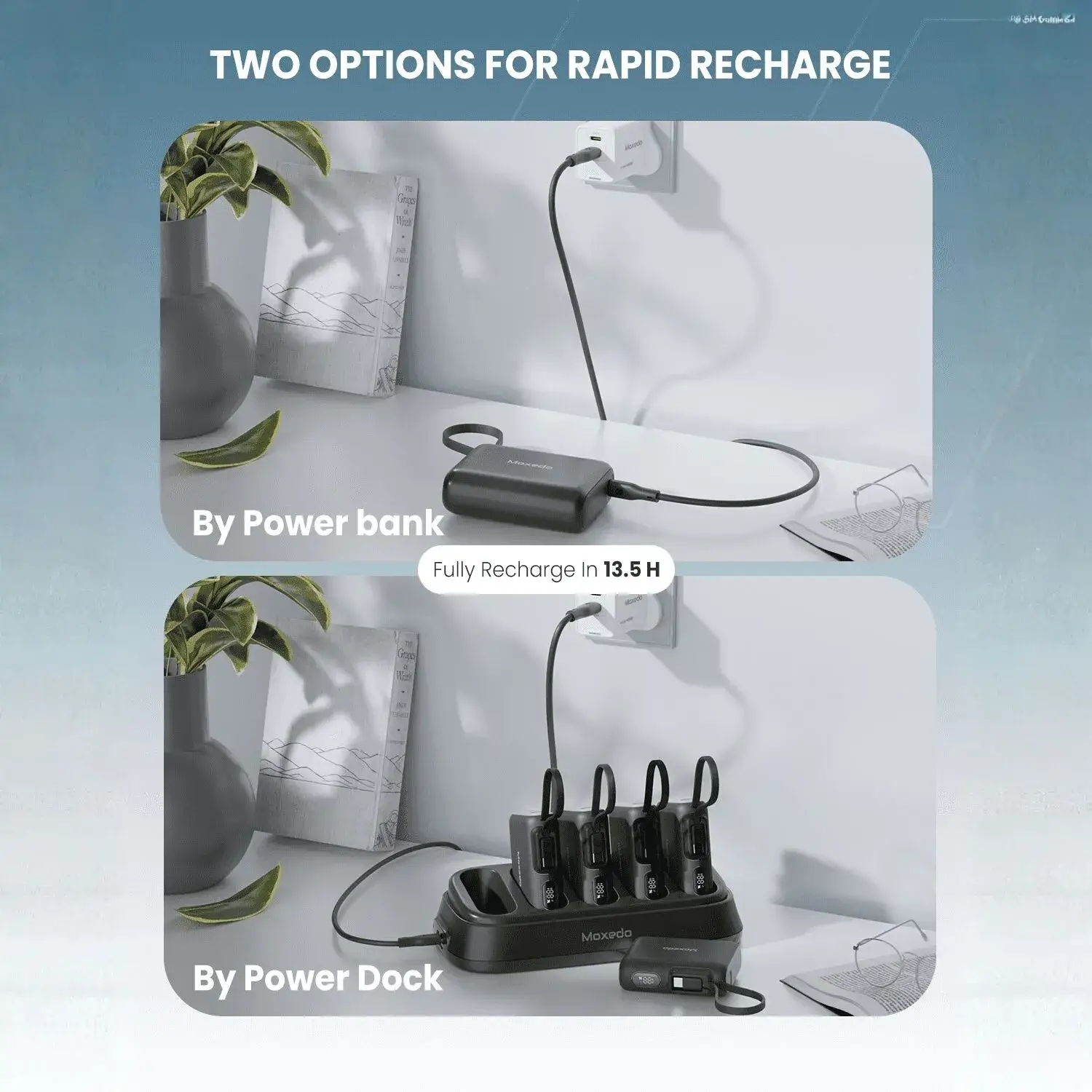 Power up your lifestyle with the Moxedo 5X Power Bank Kit, a complete multi-device charging solution built for families, businesses, and heavy travelers. This smart charging system includes five compact 10000mAh power banks, each equipped with 20W USB-C Power Delivery, plus a premium charging dock that keeps everything organized and ready to use.