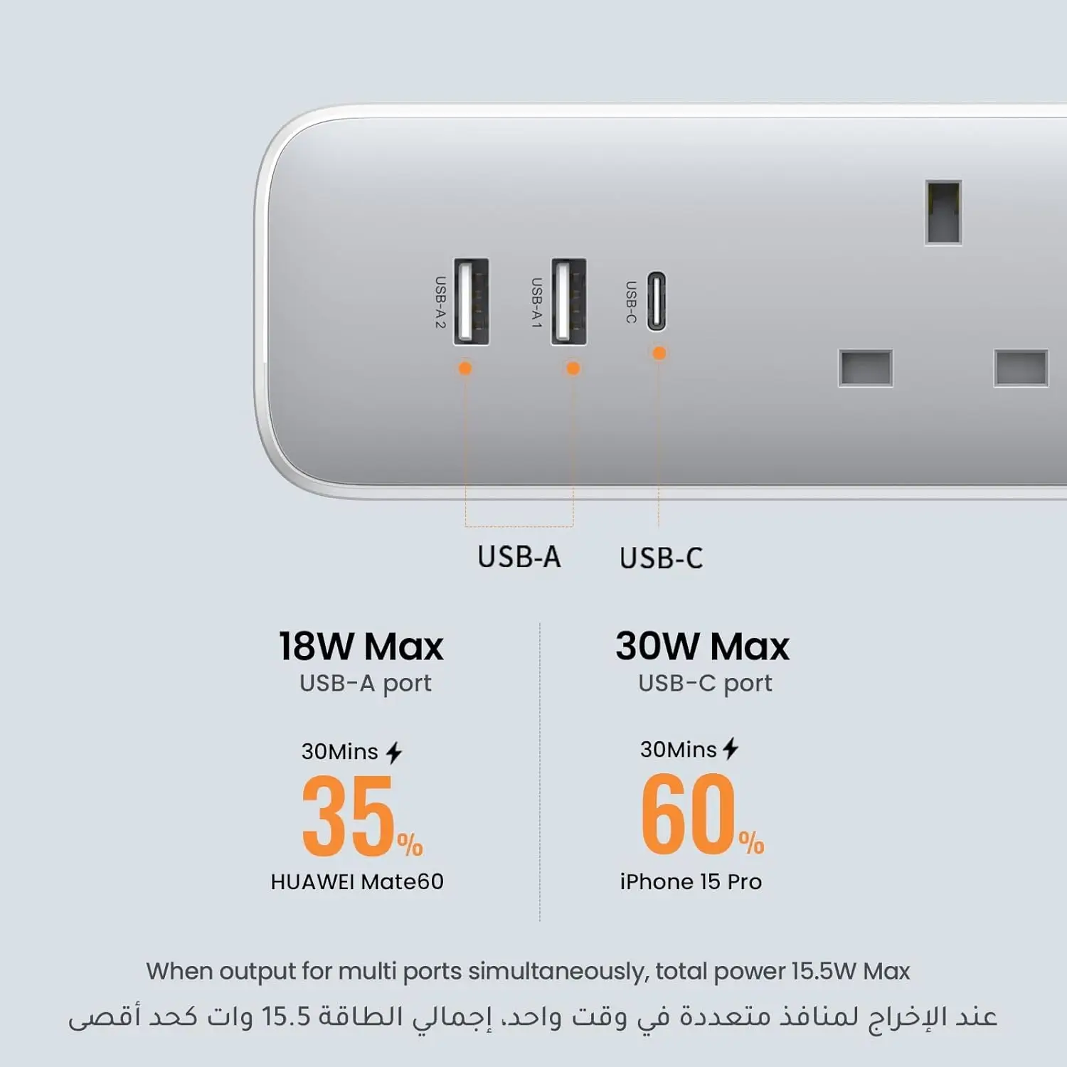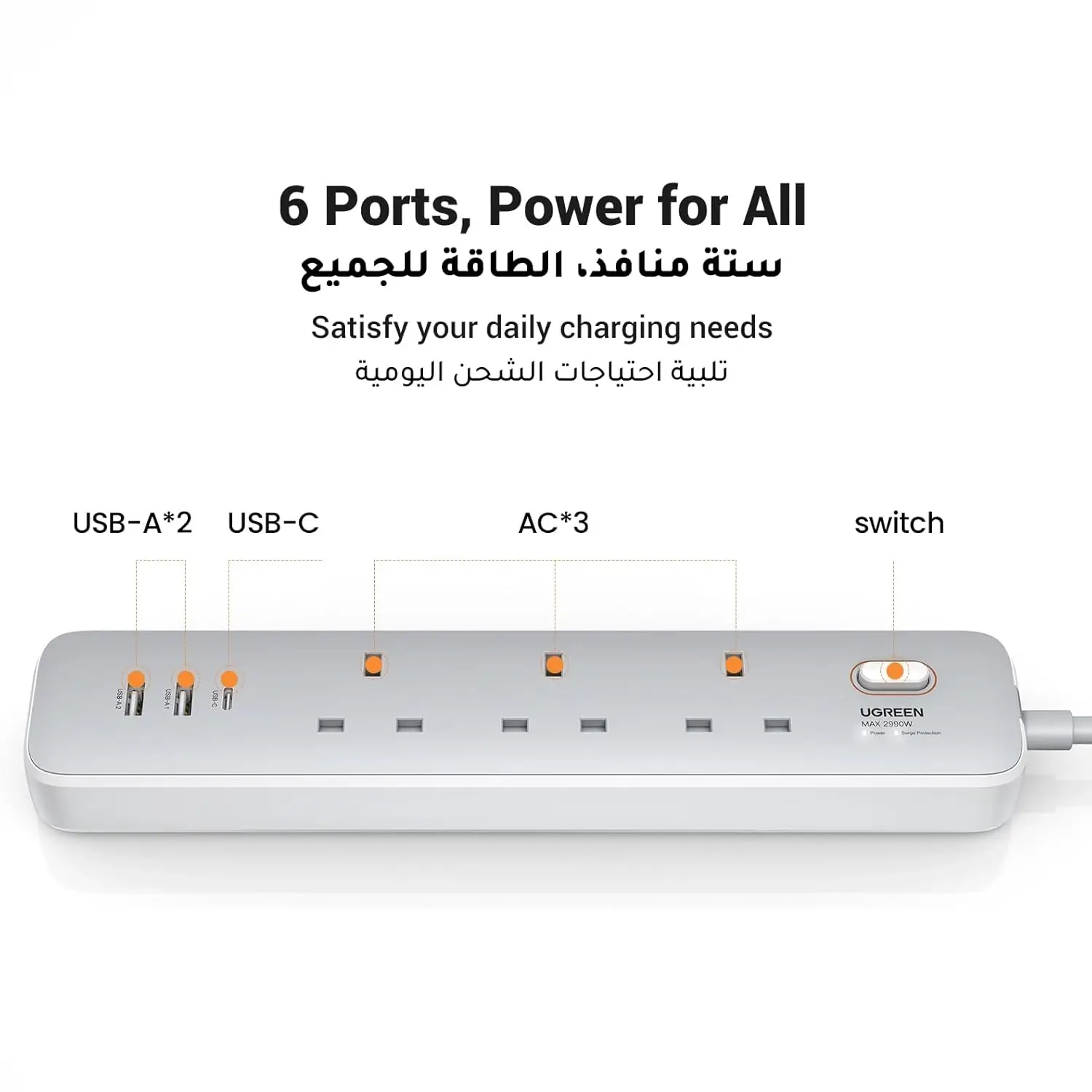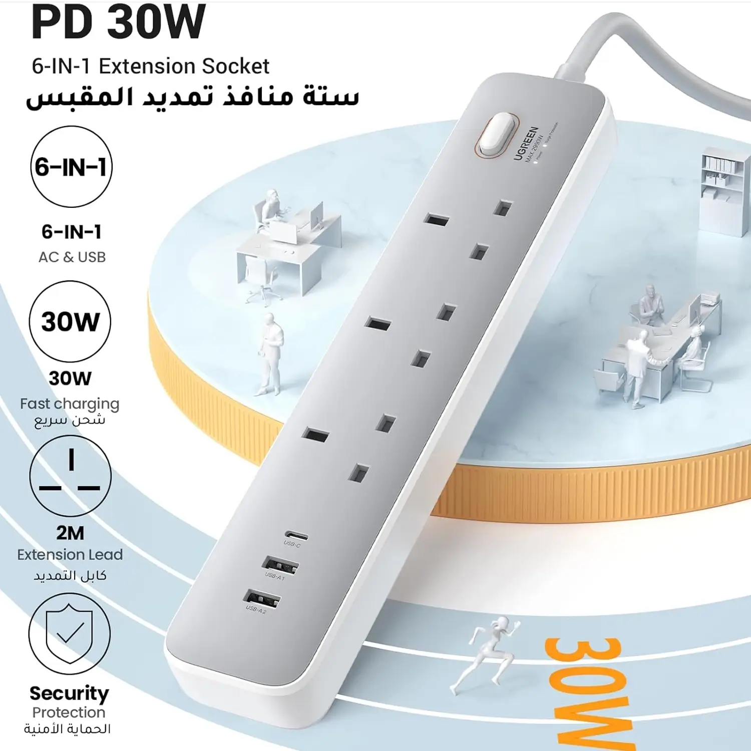 Stay powered and protected with the UGREEN Surge Protector Extension. Designed for modern homes and workspaces, it combines 3 AC outlets and multiple USB ports, including a high-speed 30W USB-C PD port, allowing you to charge up to 6 devices simultaneously. Built-in surge protection safeguards your electronics from voltage spikes, while its compact and stylish design fits neatly on any desk or setup.