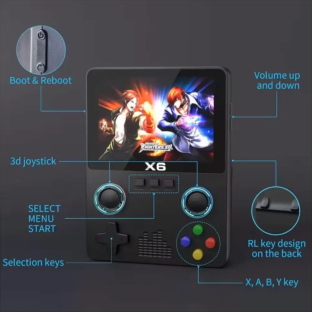 Equipped with a dual joystick design, the X6 provides smooth, precise controls for both casual and competitive play. Its lightweight, ergonomic build makes it comfortable to hold, while the portable size allows you to enjoy gaming anytime, anywhere.